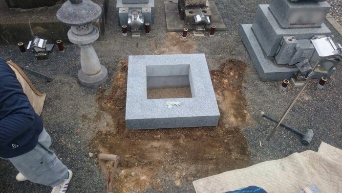 敷石を据付けます。この敷石はお墓の一番下の石になります。