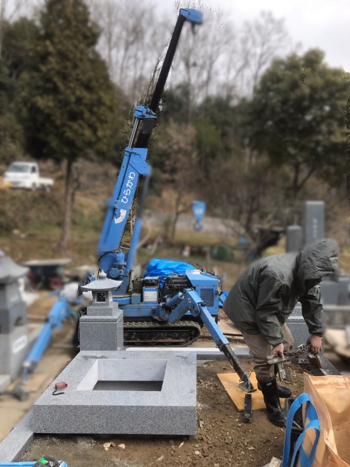 ⬆︎クレーンを設置して、お墓を据え付けていきます。