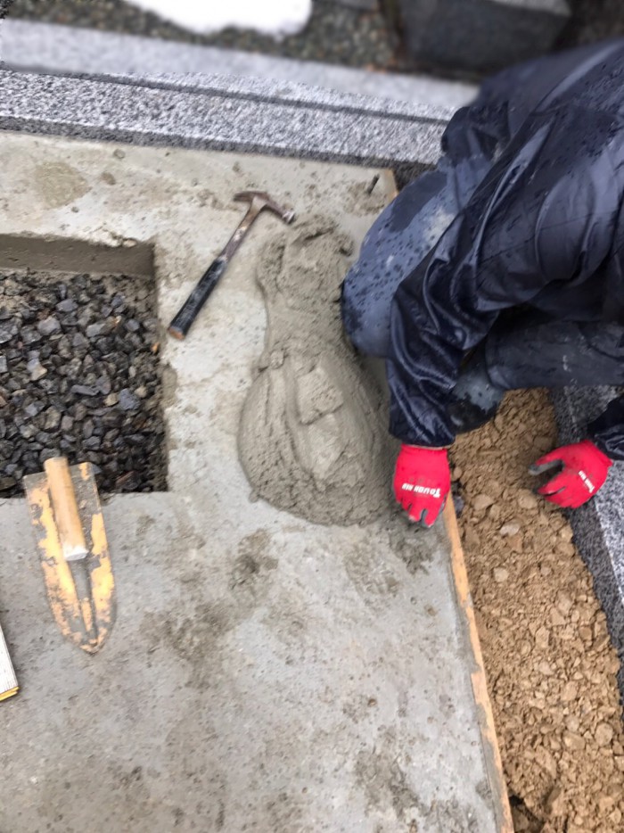 ⬆︎型枠をした中に、コンクリートを流し込み、コテを使い整えてお墓の基礎工事も完成です。